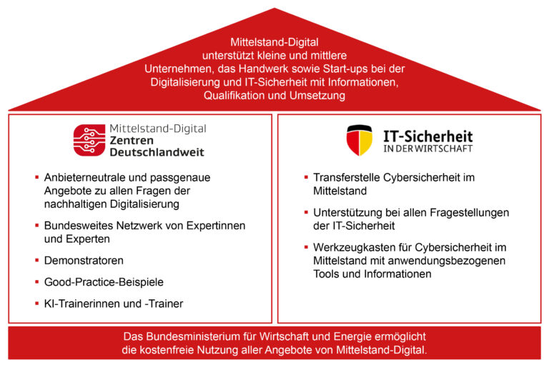 Das Mittelstand-Digital Netzwerk bietet mit den Mittelstand-Digital Zentren und der “Initiative IT-Sicherheit in der Wirtschaft” umfassende Unterstützung bei der Digitalisierung.